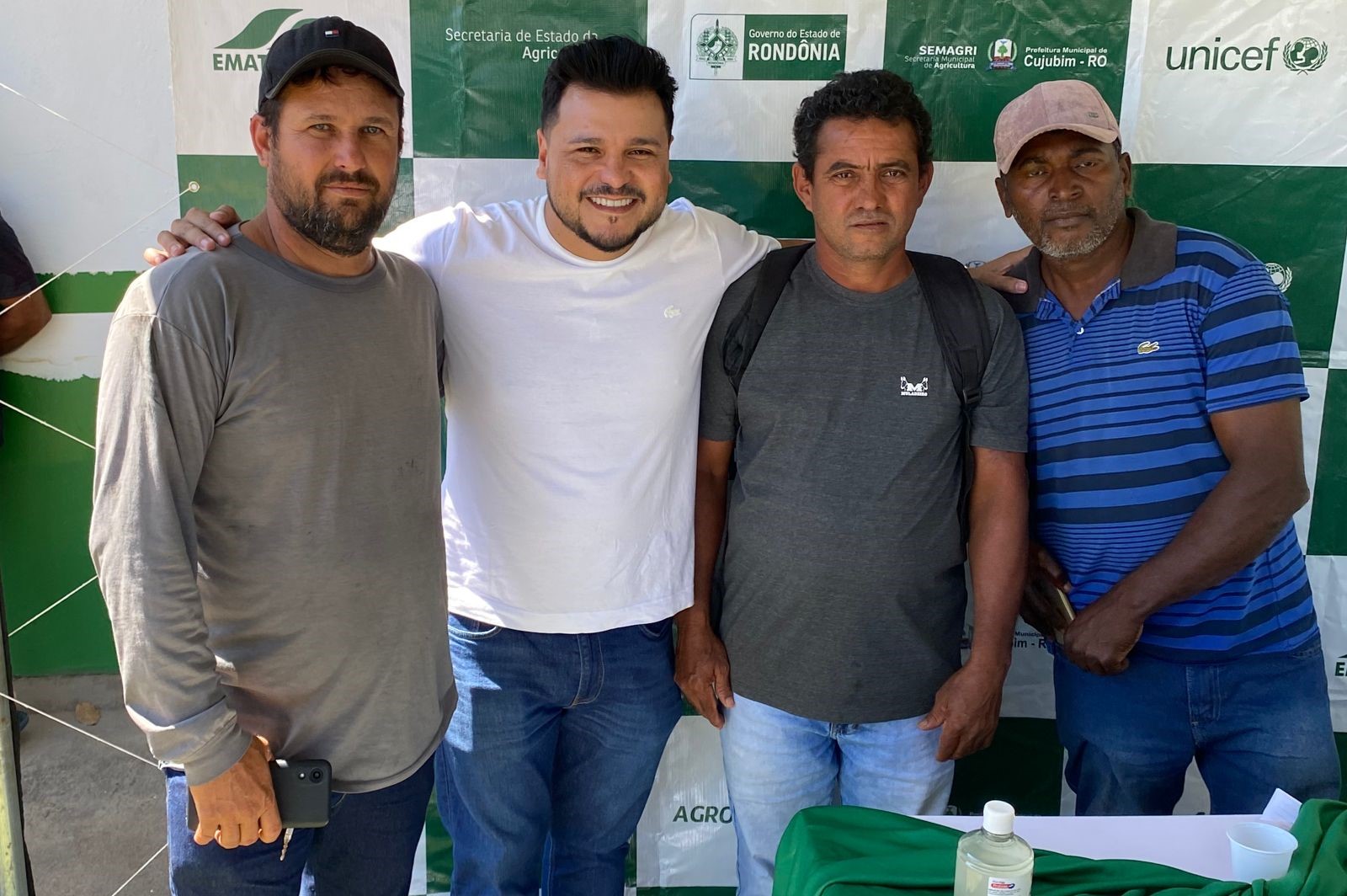 Estiveram presentes na solenidade de entrega o vereador Reginaldo Galo Velho, Ivanilda Coimbra (gerente EMATER), Sérgio (sec. Agricultura), prefeito João Becker, Adnei (parceiro local), Sandra (sec. Saúde) e Natal que é produtor rural de Cujubim.
