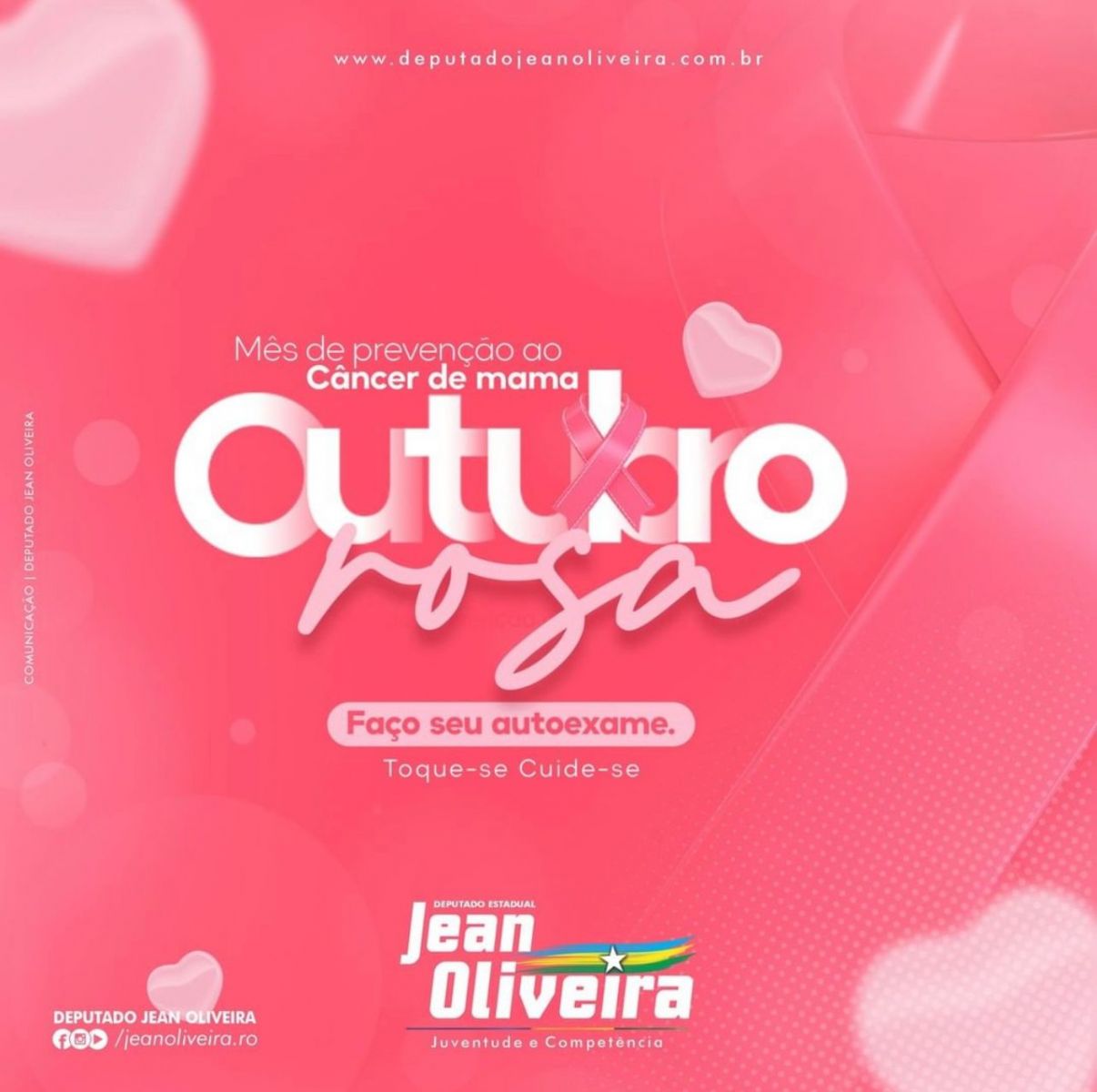 O deputado Jean Oliveira (MDB) se solidariza e apoia o “Outubro Rosa”, campanha mundial de conscientização sobre a importância da prevenção e diagnóstico precoce do câncer de mama. O movimento, que tem adesão de instituições oficiais e de diversos setores da sociedade civil, promove ações que visam informar e conscientizar a população sobre a necessidade da prevenção e diagnóstico precoce do câncer de mama.