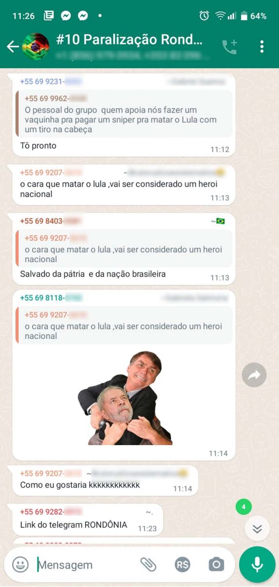 “Ô pessoal do grupo, quem apoia nós fazermos uma ‘vaquinha’ pra pagar um sniper pra matar o Lula com um tiro na cabeça?”.