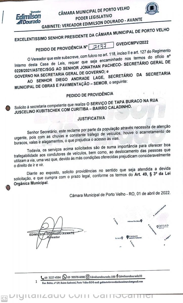 Através do Pedido de Providência nº 2.137/2022, o vereador Edimilson Dourado (Avante), solicitou junto à Secretaria Municipal de Obras (Semob), o serviço de tapa buraco na Rua Juscelino Kubitschek com Rua Curitiba, Bairro Caladinho, na zona sul de Porto Velho.