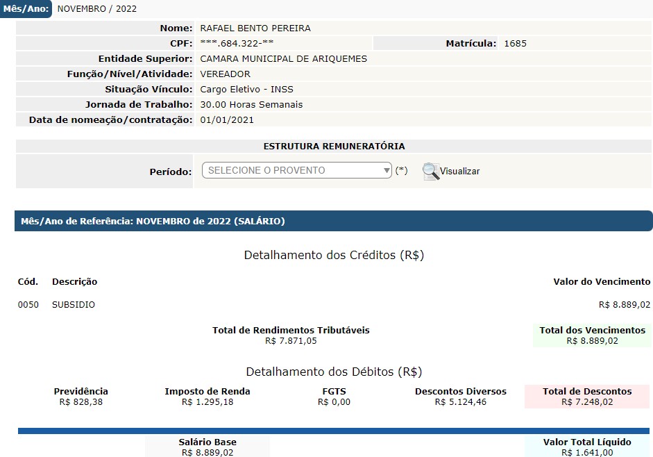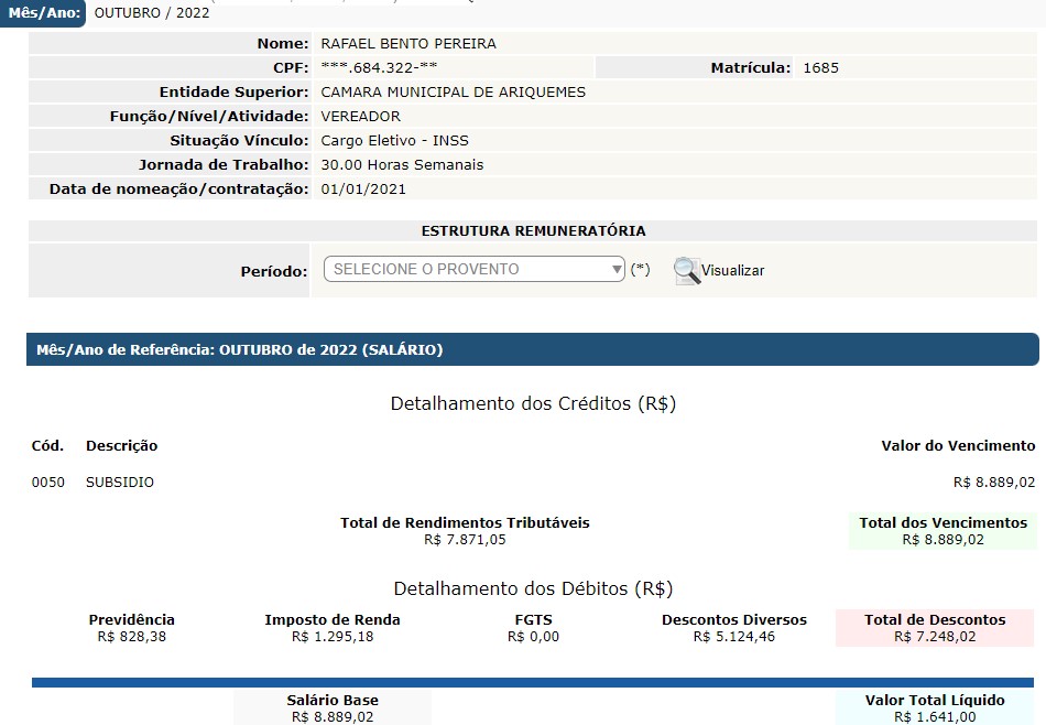 Último salário bruto de Rafael disponível no Portal da Transparência da Câmara de Ariquemes é de quase R$ 8.900...