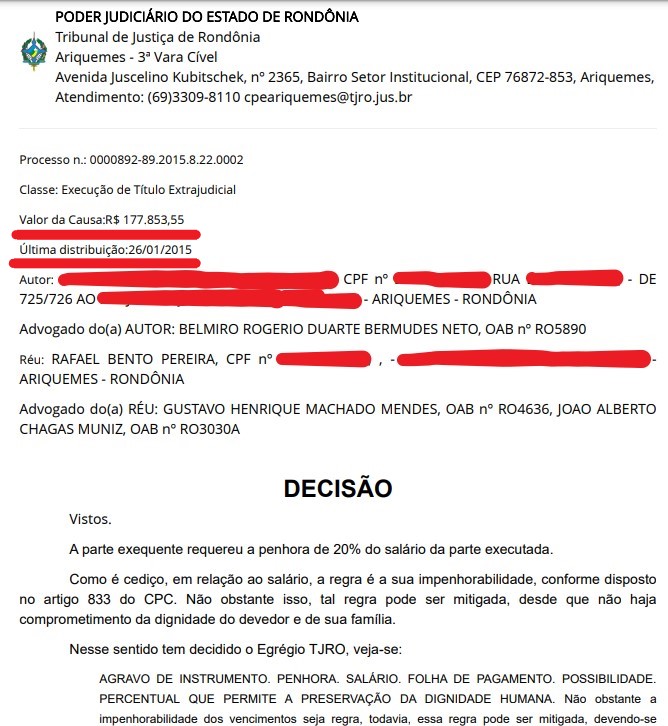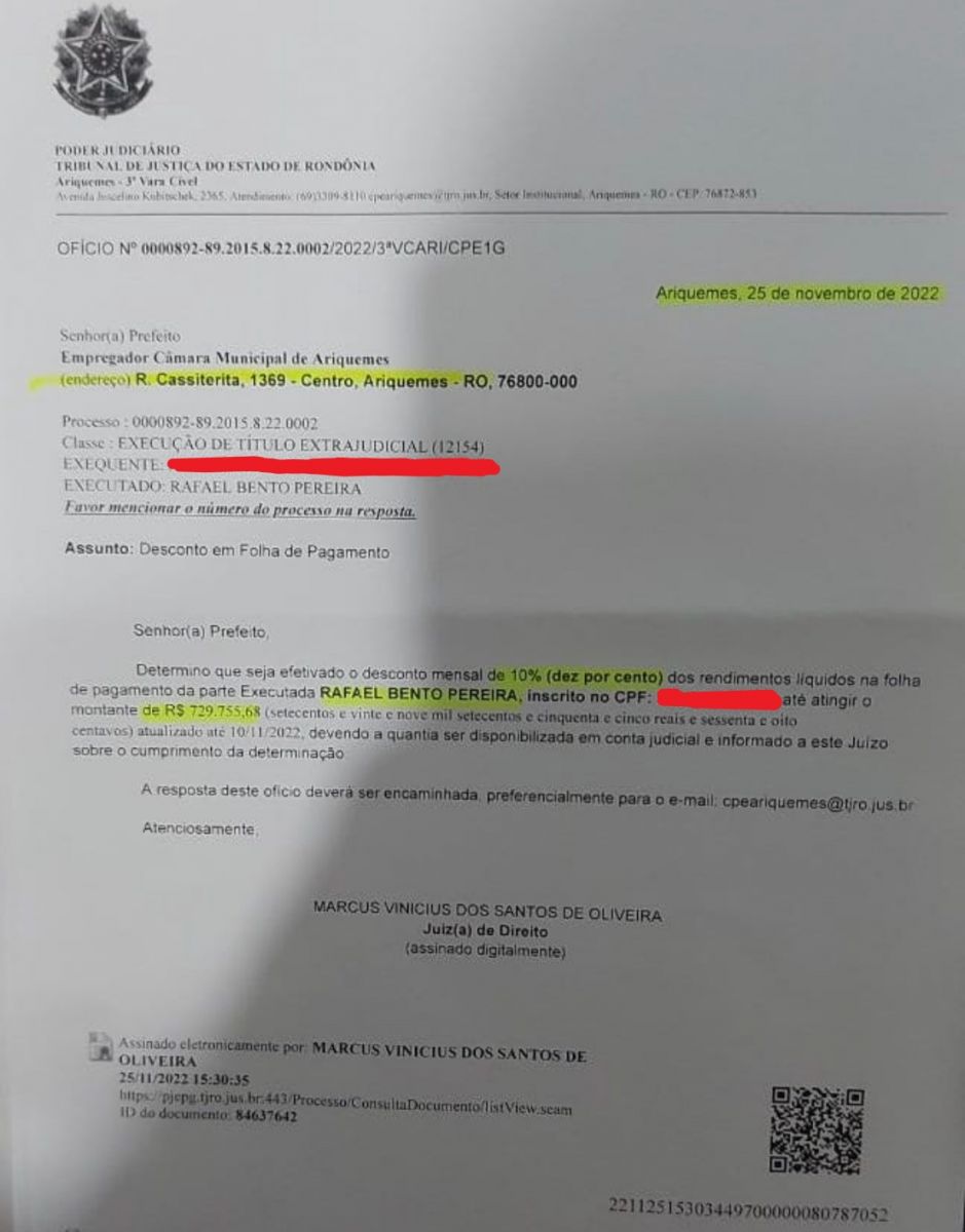 Em ofício enviado à Câmara de Ariquemes pelo juiz Marcus Vinicius dos Santos Oliveira no dia 25 de novembro deste ano, a causa tem valores atualizados de R$ 729.755,68 até o dia 11 de novembro de 2022, onde já determina o desconto mensal de 10% do salário de Rafael Bento Pereira, mais conhecido como Rafael é o Fera.