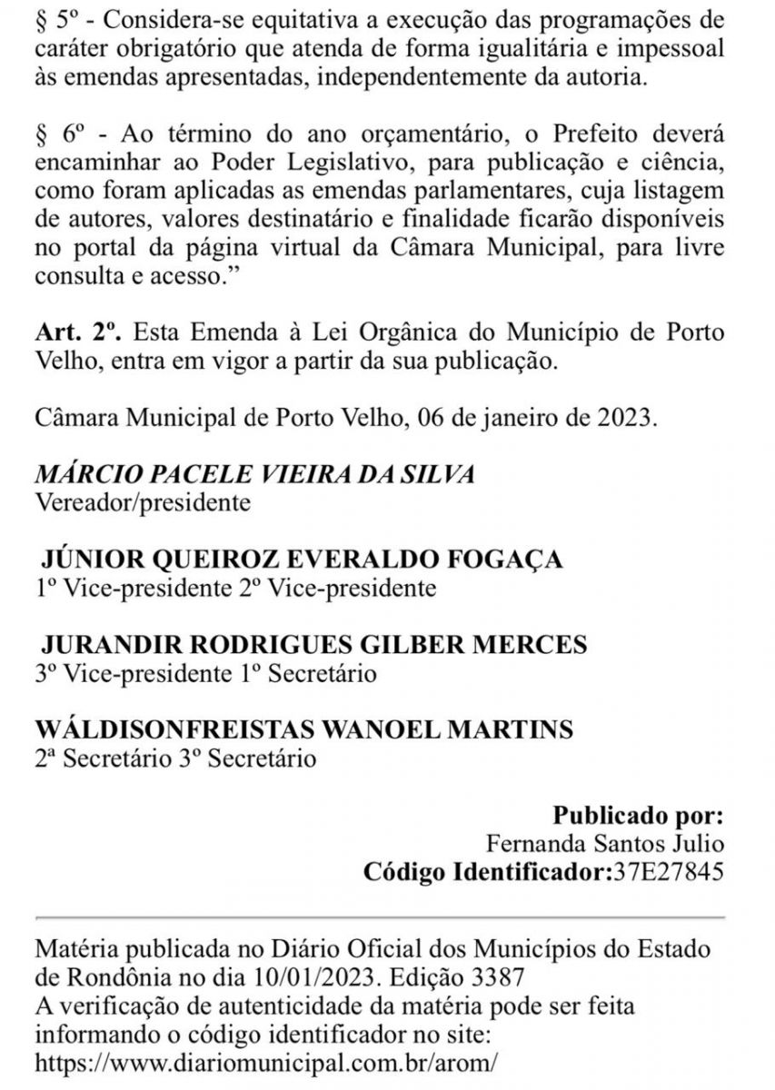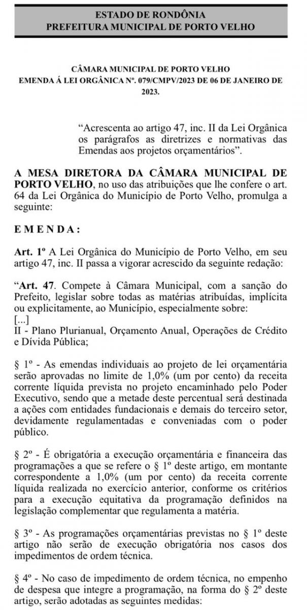 A Câmara Municipal de Porto Velho promulgou esta semana passada a Emenda à Lei Orgânica 079/2023 que garante a indicação de emendas aos 21 vereadores, no valor de R$ 1,2 milhão.