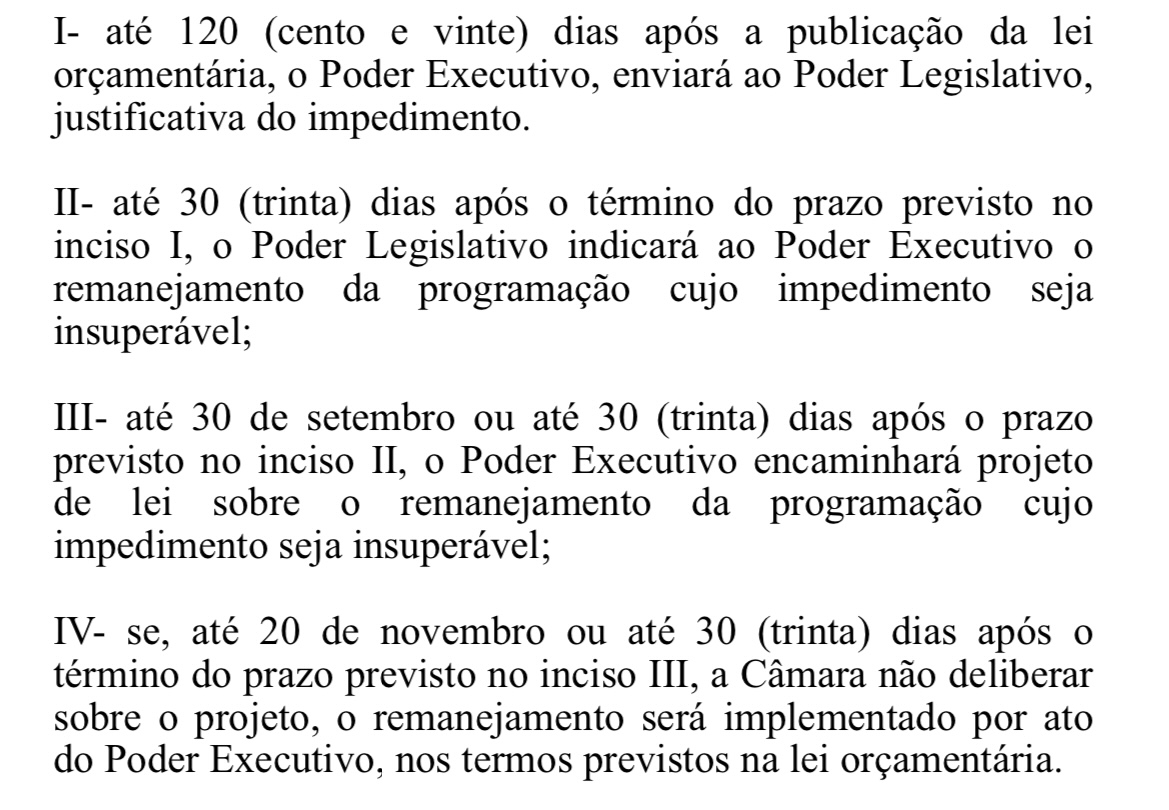 A emenda foi promulgada por presidente Márcio Pacele (PSB) e alterado o Invisível II do artigo 47 da Constituição Municipal que trata do Plano Plurianual, Orçamento anual, Operações de crédito e dívida pública do Município.