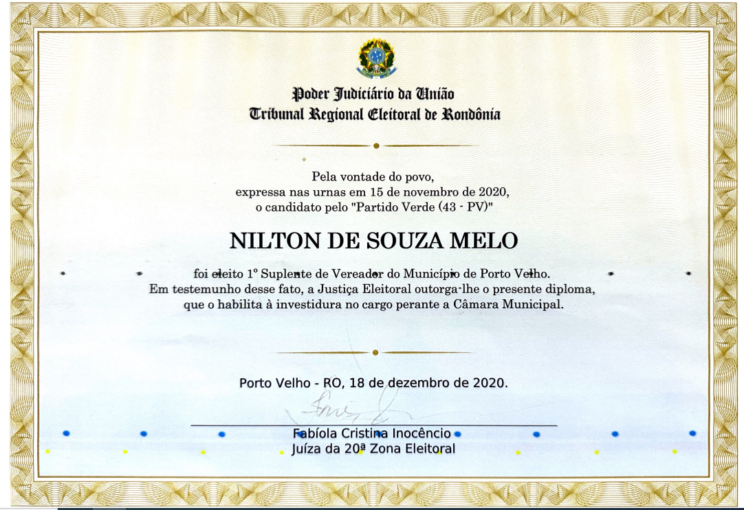 Diploma dado pela Justiça Eleitoral a Nilton Souza, que teve 1.711 votos nas Eleições 2020 - Reprodução de vídeo