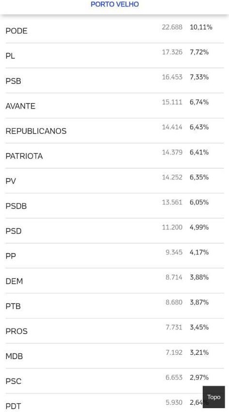 Lista da apuração das urnas em 2020 aponta que no quociente eleitoral, PV teve quase o dobro de votos do PROS - Reprodução de tela