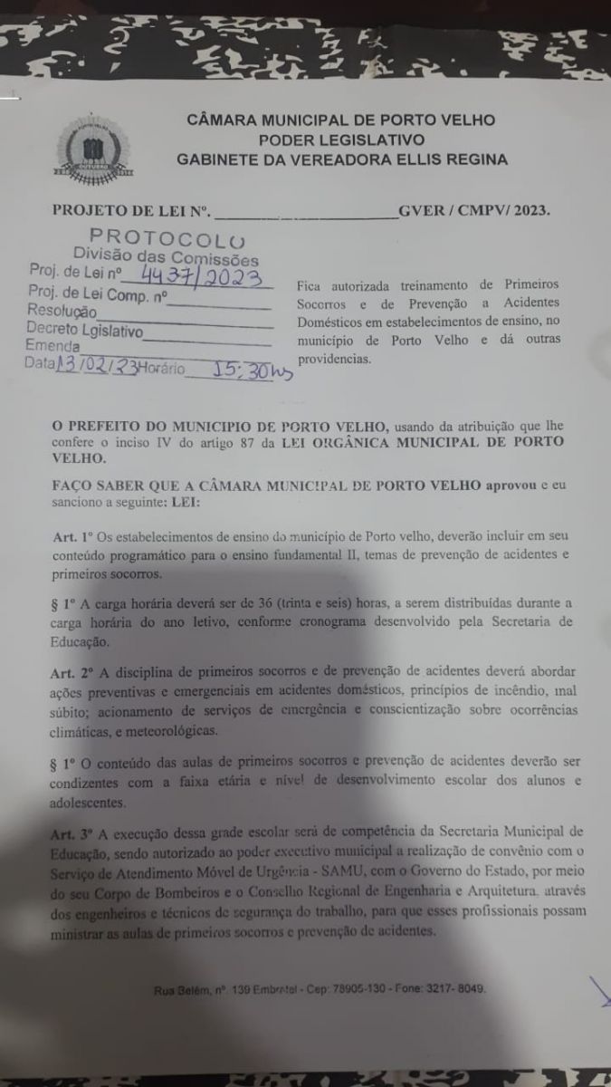 Um Projeto de Lei, de autoria da vereadora Ellis Regina (Podemos) autoriza o treinamento de primeiros socorros e de prevenção de acidentes domésticos nas escolas municipais. O PL recebeu o número 4377/2023 e está em tramitação nas comissões permanentes da Casa e deve ser votado nas próximas sessões ordinárias.
