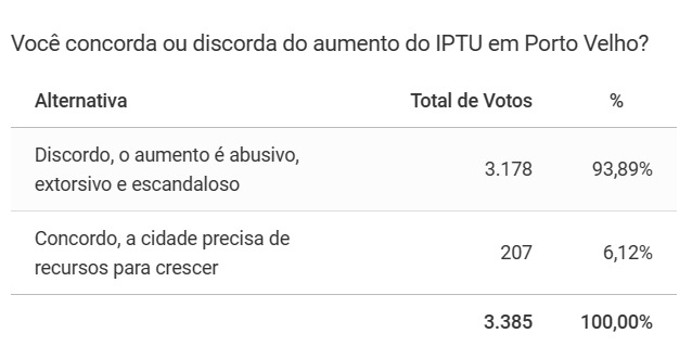 Antes disso, o Rondoniaovivo lançou uma enquete que teve quase 100% de adesões, onde 3.178 votos eram contra o aumento “abusivo, extorsivo e escandaloso” (93,89% do total).