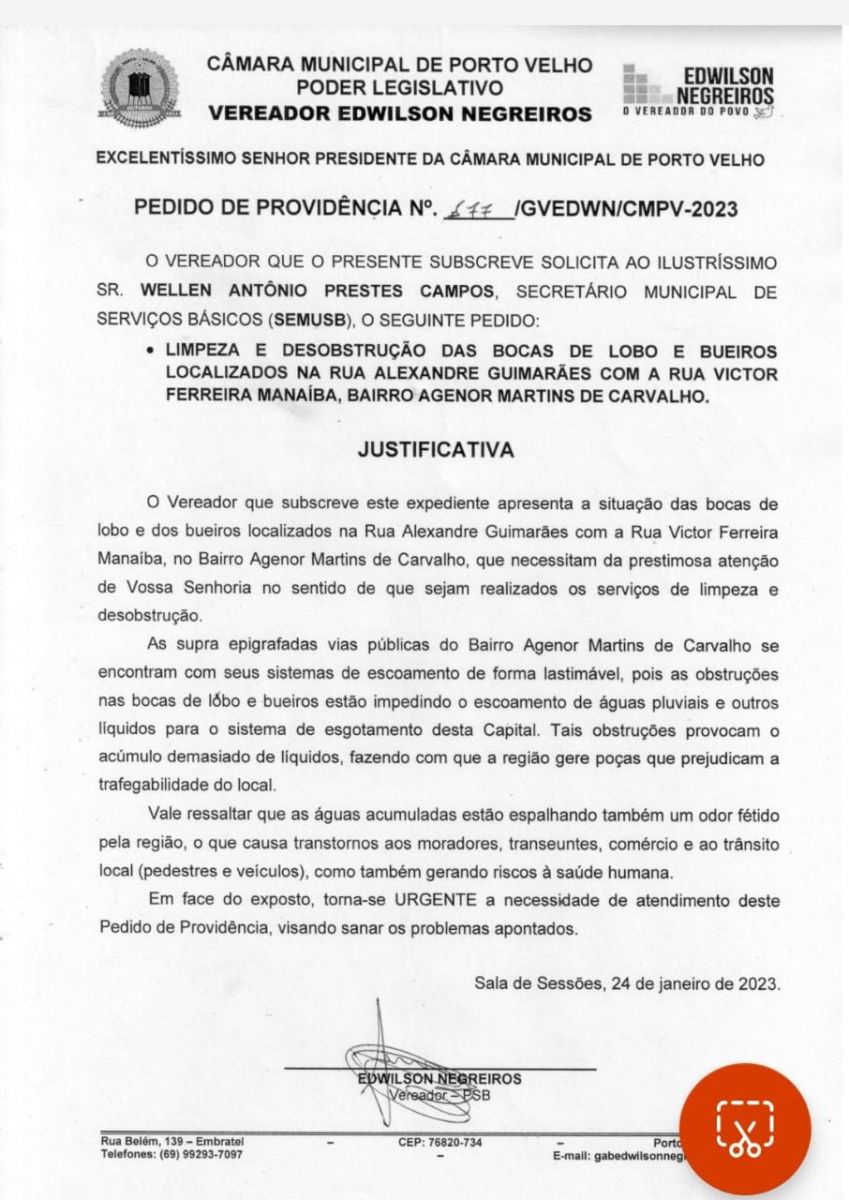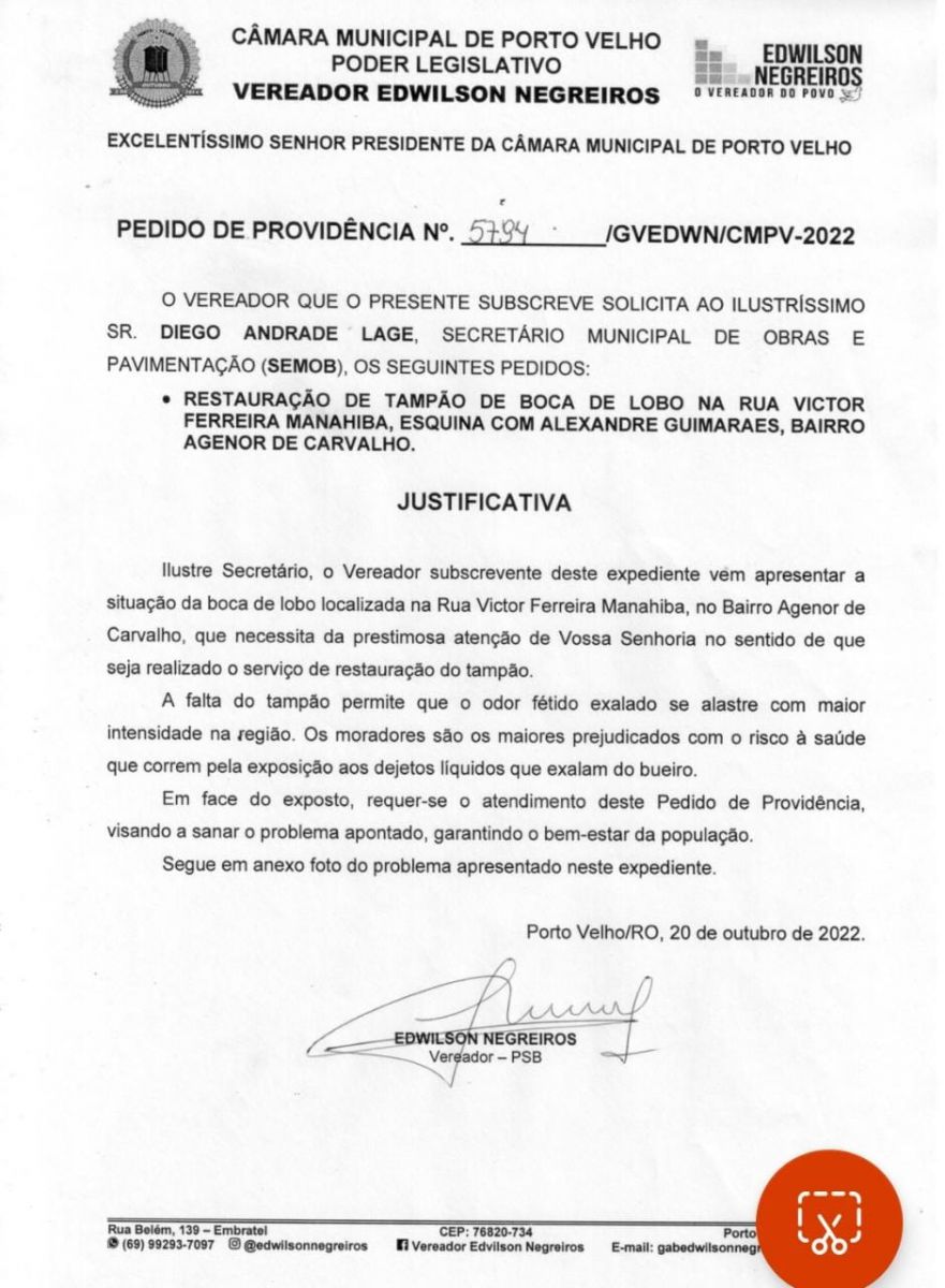 O primeiro fora enviado à Secretaria Municipal de Obras (SEMOB), comandada por Diego Andrade Lage. Na demanda, Negreiros indicou a necessidade de restauração de tampão na “boca de lobo” situada à Rua Victor Ferreira Manahiba, esquina com Alexandre Guimarães.