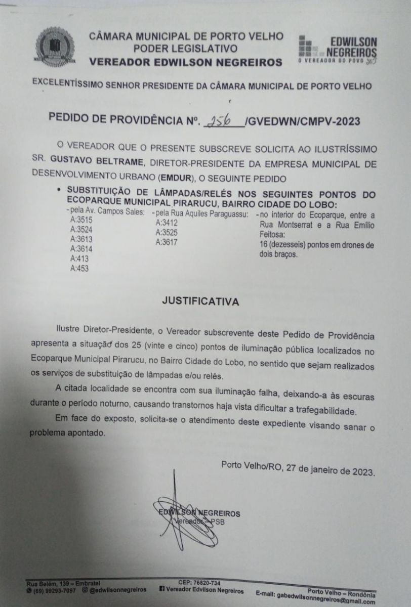 O vereador-presidente da Câmara Municipal de Porto Velho Edwilson Negreiros, do PSB, fez mais uma solicitação à Empresa de Desenvolvimento Urbano (EMDUR).