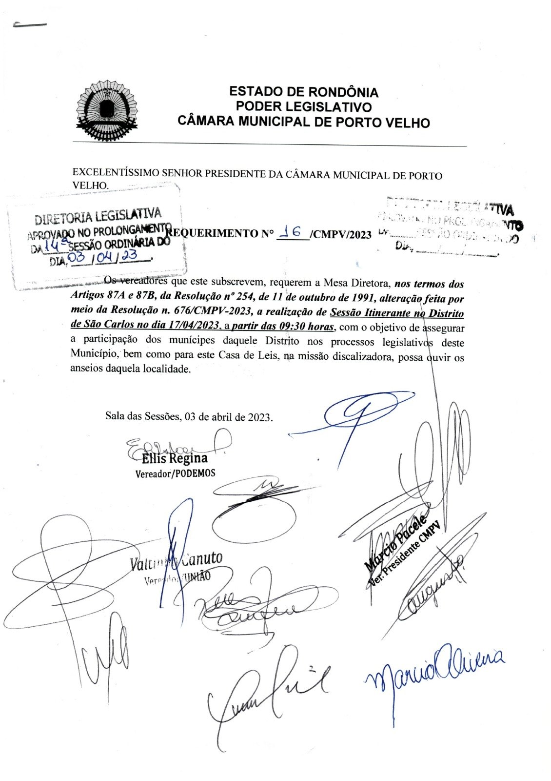 A vereadora Ellis Regina é autora do Requerimento 16/CMPV-2023, que aprovou a realização da sessão itinerante da Câmara Municipal de Porto Velho no distrito de São Carlos no dia 17 de abril, na sessão ordinária de segunda-feira.