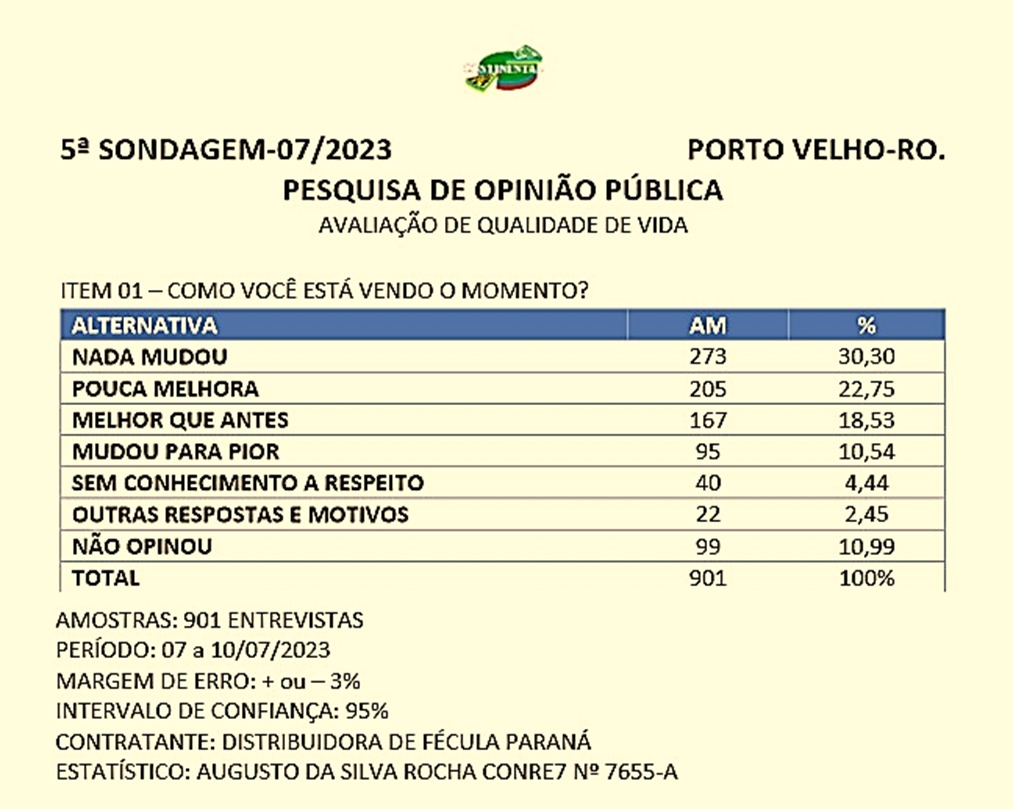 No quesito número um, a pesquisa fez uma avaliação sobre a qualidade de vida do cidadão com a seguinte pergunta: “Como você está vendo o momento”. Para mais de 30% dos entrevistados, conforme a tabela abaixo, “Nada mudou” e outros 22,75% foi “Pouca a melhora”.