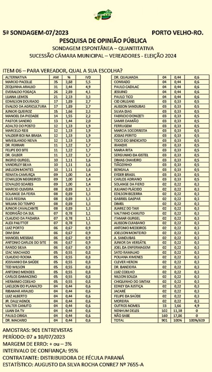 No último quesito, a pesquisa foi espontânea sobre a preferência do eleitor sobre seus candidatos a vereador em 2024.