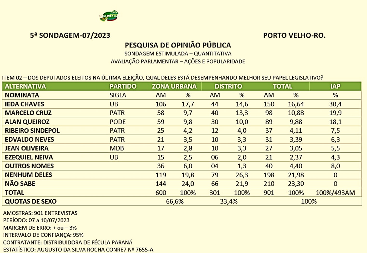 A pesquisa foi realizada com 901 entrevistados (eleitores) e realizada entre os dias 7 a 10 de julho de 2023. Possui margem de erro de + ou -3% e nível de confiança de 95%. Foi contratada pela empresa Distribuidora de Fécula Paraná e assinada pelo estatístico Augusto da Silva Rocha (Conre 7655-A).