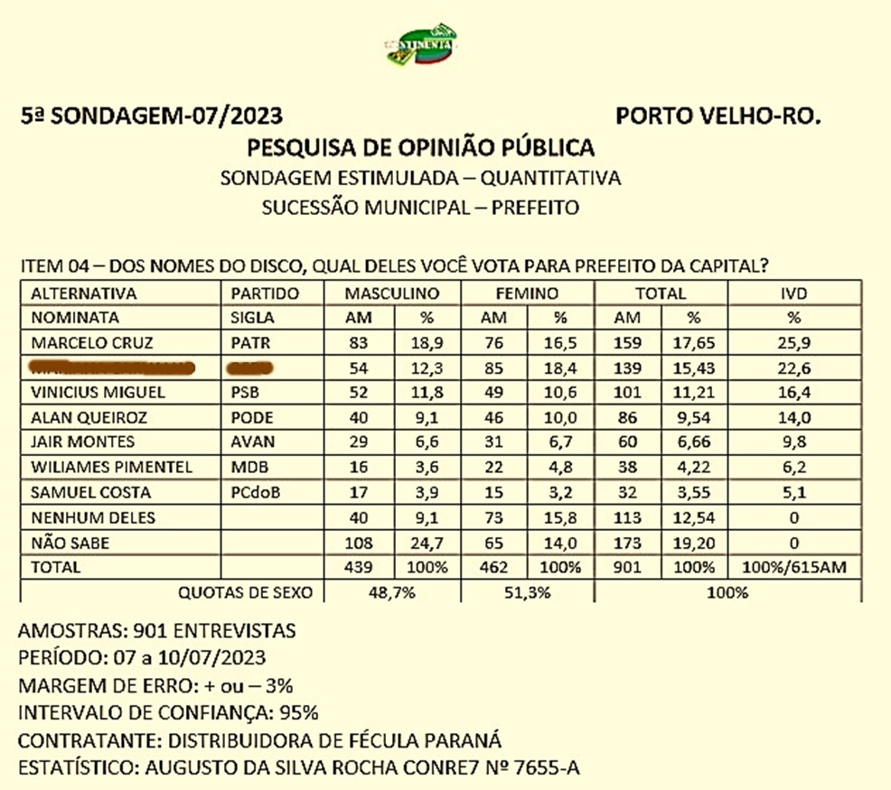 A primeira colocação é do deputado estadual e Presidente da Assembleia Legislativa de Rondônia, Marcelo Cruz (Patriota), com 25,9% das intenções de voto.