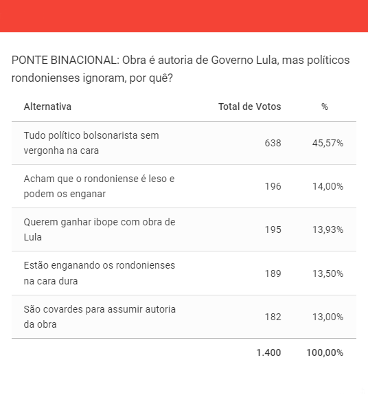 A enquete feita nesta última terça-feira (18) de julho, questionou a opinião dos leitores sobre o motivo de porque os políticos rondonienses, embora tenham usado a notícia para se promoverem, ignoram que o plano da Ponte Binacional Brasil/Bolívia ser de autoria do Governo Presidente Lula.