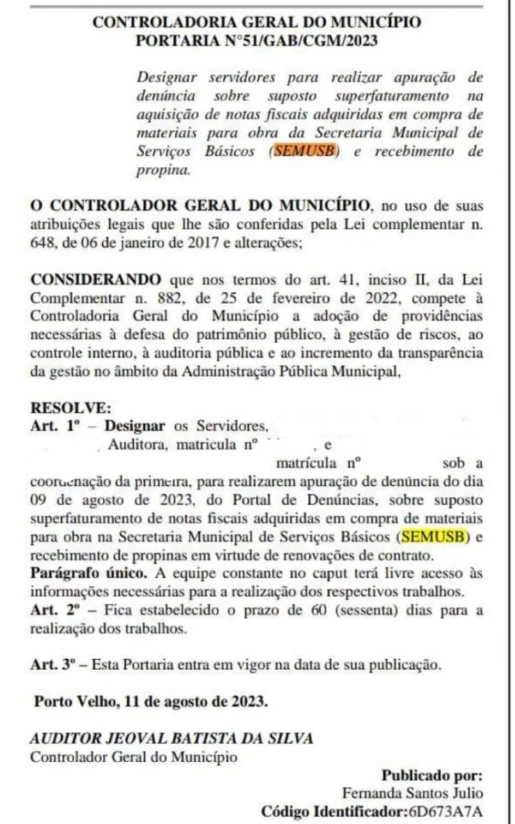 O controlador-geral do Município de Porto Velho, o auditor Jeoval Batista da Silva, designou auditores para apurar denúncias de suposto superfaturamento em notas fiscais de compras de materiais para a Secretaria Municipal de Serviços Básicos (Semusb). Atualmente a secretaria tem como gestor Clebeson Pacheco.