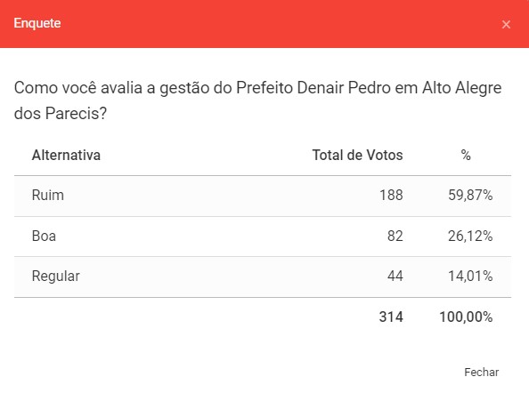 Apesar da pouca adesão dos moradores da cidade na enquete, Denair Pedro teve grande rejeição dentre os participantes. Quase 60% dos votantes acham ruim a gestão do atual prefeito.