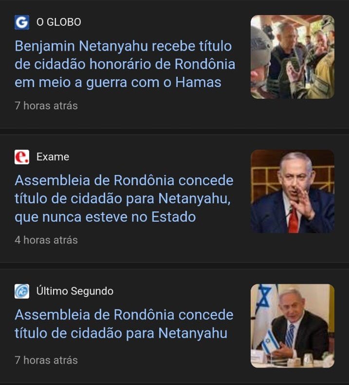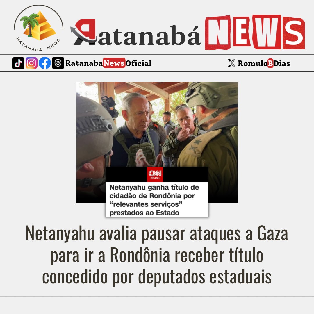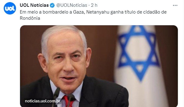 "Benjamin Netanyahu destacou-se como líder de destaque, desempenhando papel fundamental no fortalecimento dos laços entre Israel e o Brasil. Sua visão e comprometimento foram fundamentais para o estabelecimento de parcerias significativas que transcendem fronteiras geográficas", escreveu o deputado, dizendo ainda aguardar ansiosamente "a visita do Primeiro Ministro (sic) a Rondônia".
