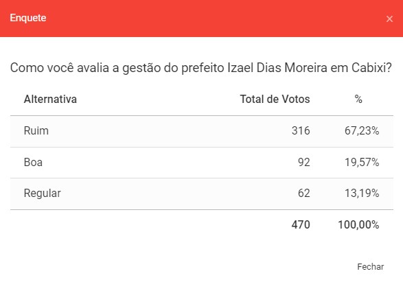 Rondoniaovivo está realizando uma série de enquetes para saber o grau de satisfação da população rondoniense com os seus prefeitos. A feita na sexta-feira (20), questiono aos leitores do jornal eletrônico como avaliavam a gestão da prefeitura de Izael Dias Moreira (DEM), no município de Cabixi.