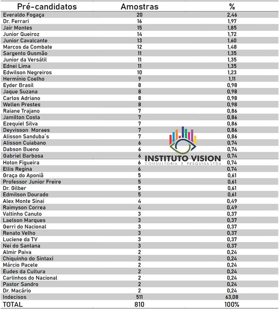 No total da lista com 44 nomes de pré-candidatos aparecem com percentuais menores os vereadores Valtinho Canuto (0,37%), além de Márcio Pacele e Macário Barros, empatados com 0,24% das intenções de voto. Também figuram na lista nomes como os ex-vereadores Junior Cavalcante (1,60%), Pastor Sandro e Chiquinho do Sintax (0,24%).