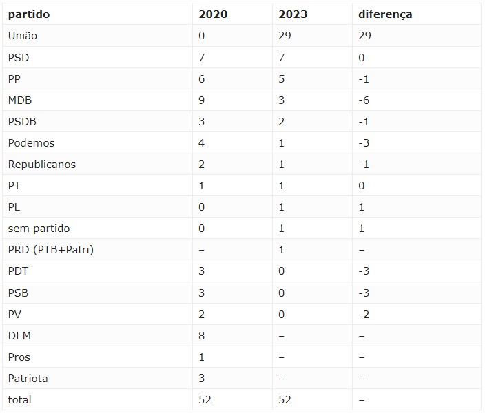 obs2: PTB se fundiu com o Patriota em 9.nov.2023, formando o PRD (Partido Renovação Democrática); PFL/DEM (fundido ao União em 2021); Pros (incluído ao Solidariedade em 2023)