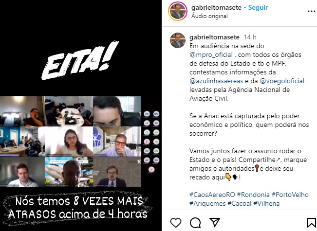 “Em audiência na sede do @mpro_oficial [Ministério Público de Rondônia], com todos os órgãos de defesa do Estado e também o MPF [Ministério Público Federal], contestamos informações da @azulinhasaereas e da @voegoloficial levadas pela Agência Nacional de Aviação Civil. Se a ANAC está capturada pelo poder econômico e político, quem poderá nos socorrer? Vamos juntos fazer o assunto rodar o estado e o país”, aponta uma legenda feita em uma postagem no Instagram.