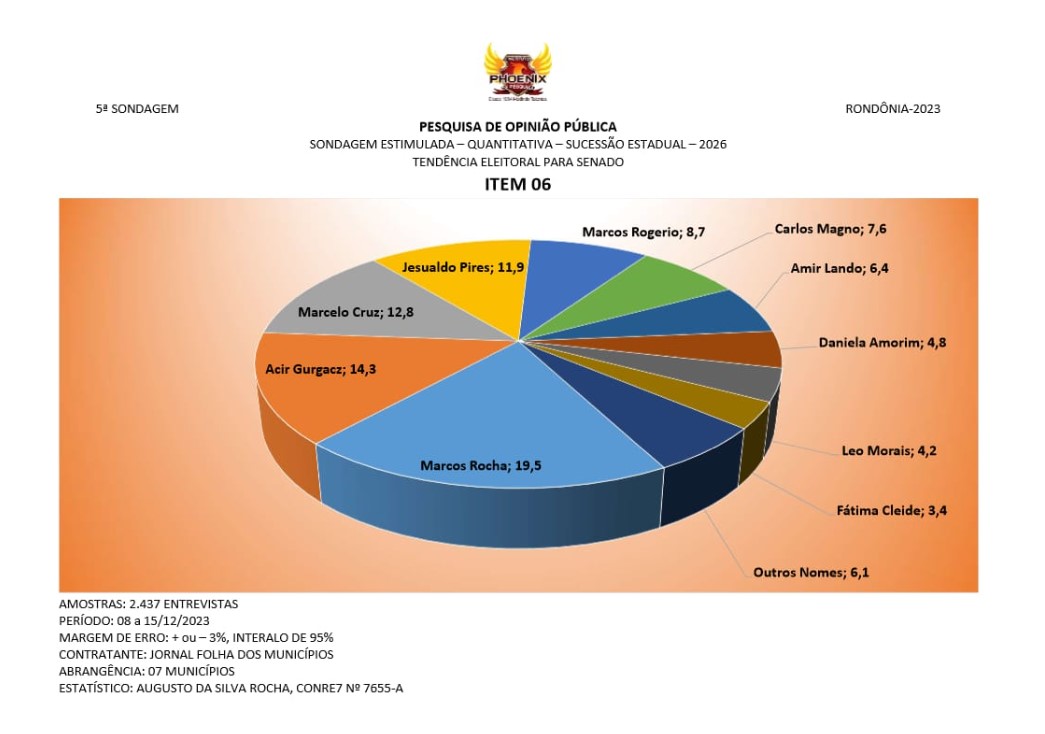O Instituto Phoenix divulgou hoje os resultados da 5ª Sondagem de Opinião Pública, apresentando a tendência eleitoral para o Senado no estado em 2026. A pesquisa, realizada entre os dias 8 a 15 de dezembro de 2023, entrevistou 4.874 pessoas em 8 municípios, com uma margem de erro de +/- 3%.