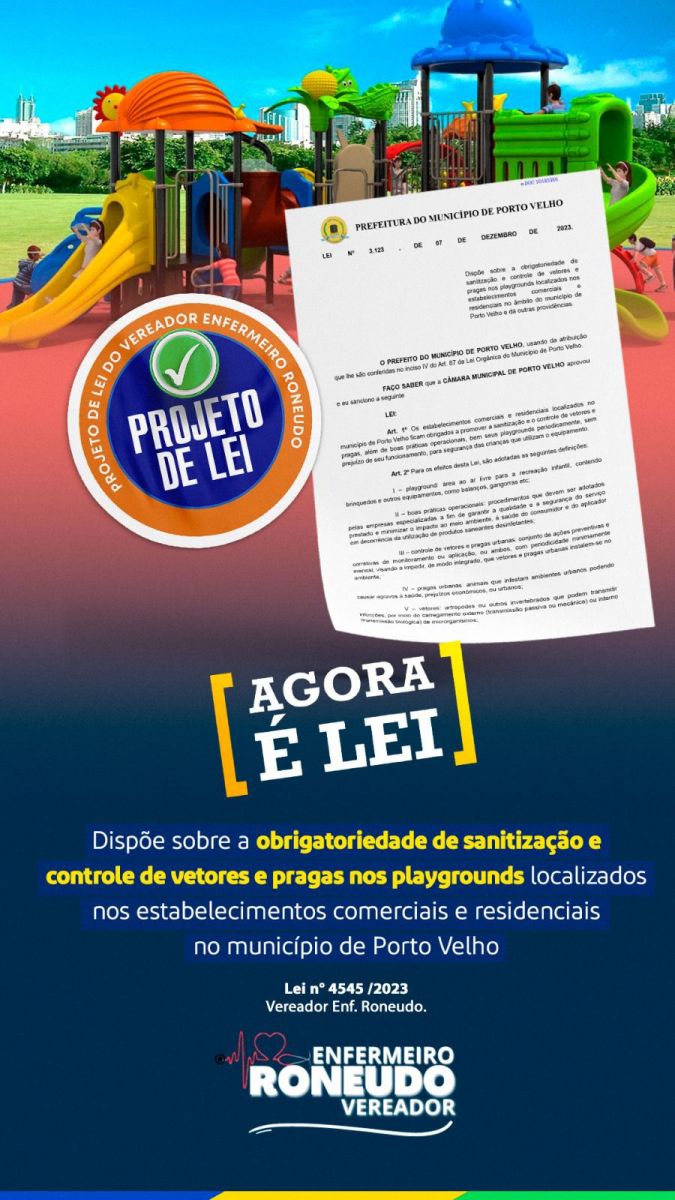 Foi sancionado o Projeto de Lei n.º 4545, de autoria do Vereador Enfermeiro Roneudo, o qual dispõe sobre a obrigatoriedade de sanitização e controle de vetores e pragas nos playgrounds localizados nos estabelecimentos comerciais e residenciais no âmbito do município de Porto Velho.