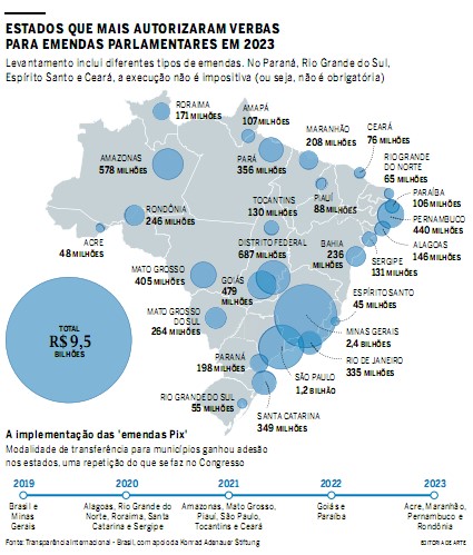 Na esfera federal, o aumento das emendas parlamentares no orçamento também ganhou destaque nas assembleias estaduais, seguindo o padrão observado no Congresso. O total autorizado por cada estado em suas leis orçamentárias para esse fim atingiu a marca de R$ 9,5 bilhões no ano passado.