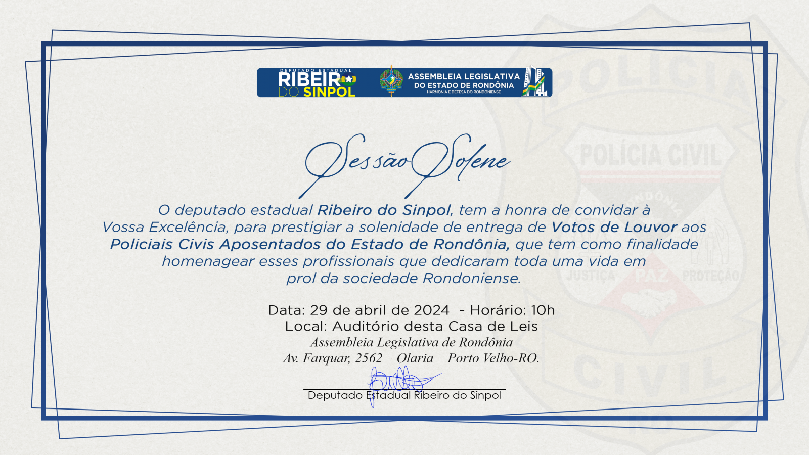Em sessão solene marcada para a segunda-feira (29), na Assembleia Legislativa de Rondônia, o deputado e 2º vice-presidente Ribeiro do Sinpol (PRD), homenageará os Policiais Civis Aposentados com Votos de Louvor. A sessão será realizada no auditório desta Casa de Leis, às 10h.
