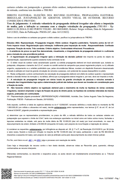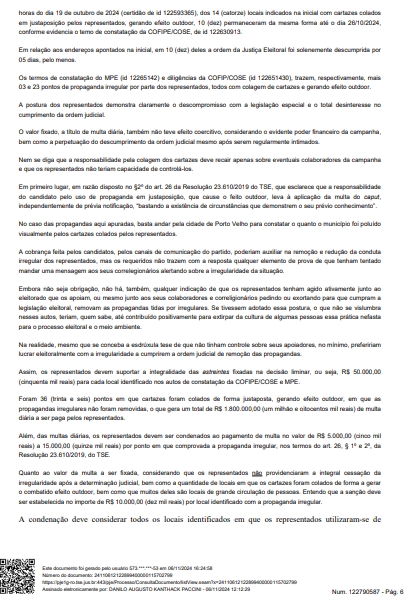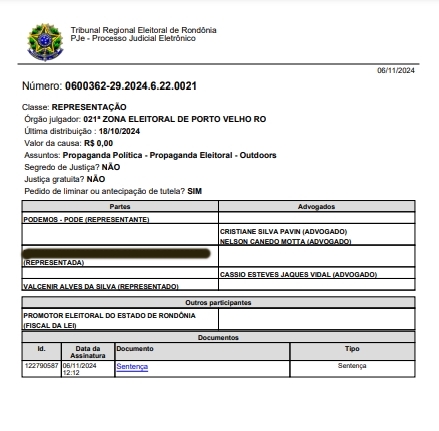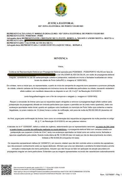 O Juiz Danilo Paccini, titular da 21ª Zona Eleitoral de Porto Velho/RO, condenou a candidata a prefeita XXXXXXX XXXXXXXX e seu vice, pastor Valcenir, por divulgação de propaganda ilegal por meio de cartazes colados nos muros, fachadas e tapumes espalhados pela cidade, um ao lado do outro, o que fez superar o limite legal para essa espécie de propaganda (até meio metro quadrado por imóvel), causando verdadeiro efeito outdoor.