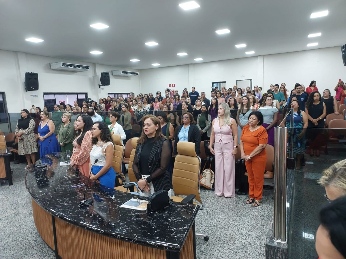 Mais de 500 profissionais da rede municipal de ensino de Porto Velho estiveram presentes na cerimônia de moção de aplausos realizada pela Câmara Municipal de Vereadores em Porto Velho na manhã desta quinta-feira (12). O evento reconheceu a contribuição de todos os profissionais da educação que se destacaram durante os últimos quatro anos. A iniciativa homenageou servidores da Educação Infantil, Ensino Fundamental I e Educação de Jovens e Adultos (EJA), além dos profissionais de apoio e suporte pedagógico à docência, que vai da zeladora, passando pela ala das merendeiras, porteiros, orientadores, supervisores, gestores escolares, a equipe administrativa e técnica, até a titular da pasta da Secretaria Municipal de Educação.