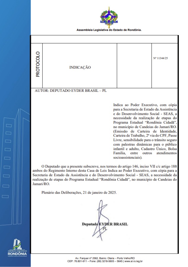 Em março, o deputado Eyder Brasil encaminhou à secretária da Seas, Luana Rocha, a solicitação para a realização do Rondônia Cidadã em Candeias do Jamari, município localizado a cerca de 25 km da capital. “Agradeço à secretária pela sensibilidade em atender nosso pedido. Levar o Rondônia Cidadã até Candeias é cumprir com nosso compromisso de facilitar o acesso da população a serviços essenciais, especialmente para quem enfrenta dificuldades nos dias úteis. Essa é uma iniciativa que fortalece a cidadania e promove inclusão social”, destacou o parlamentar.