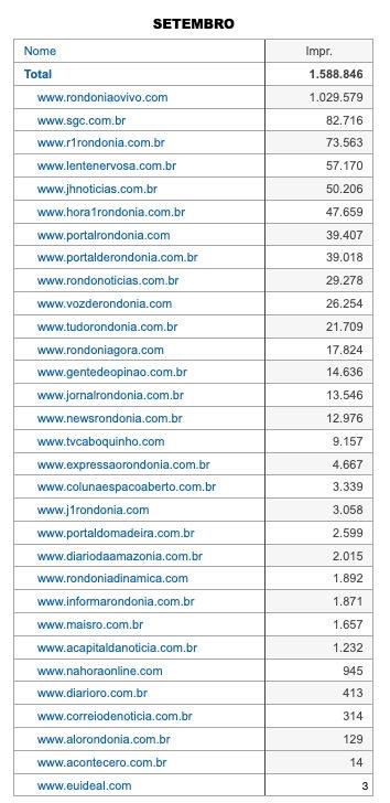 Considerando o percentual de entrega de anúncios, de acordo com o levantamento referente a setembro, o portal alcançou 64,80% de participação de audiência, enquanto o segundo colocado obteve apenas 5,20%, confirmando a fidelidade e preferência isolada dos leitores pelo Rondoniaovivo.