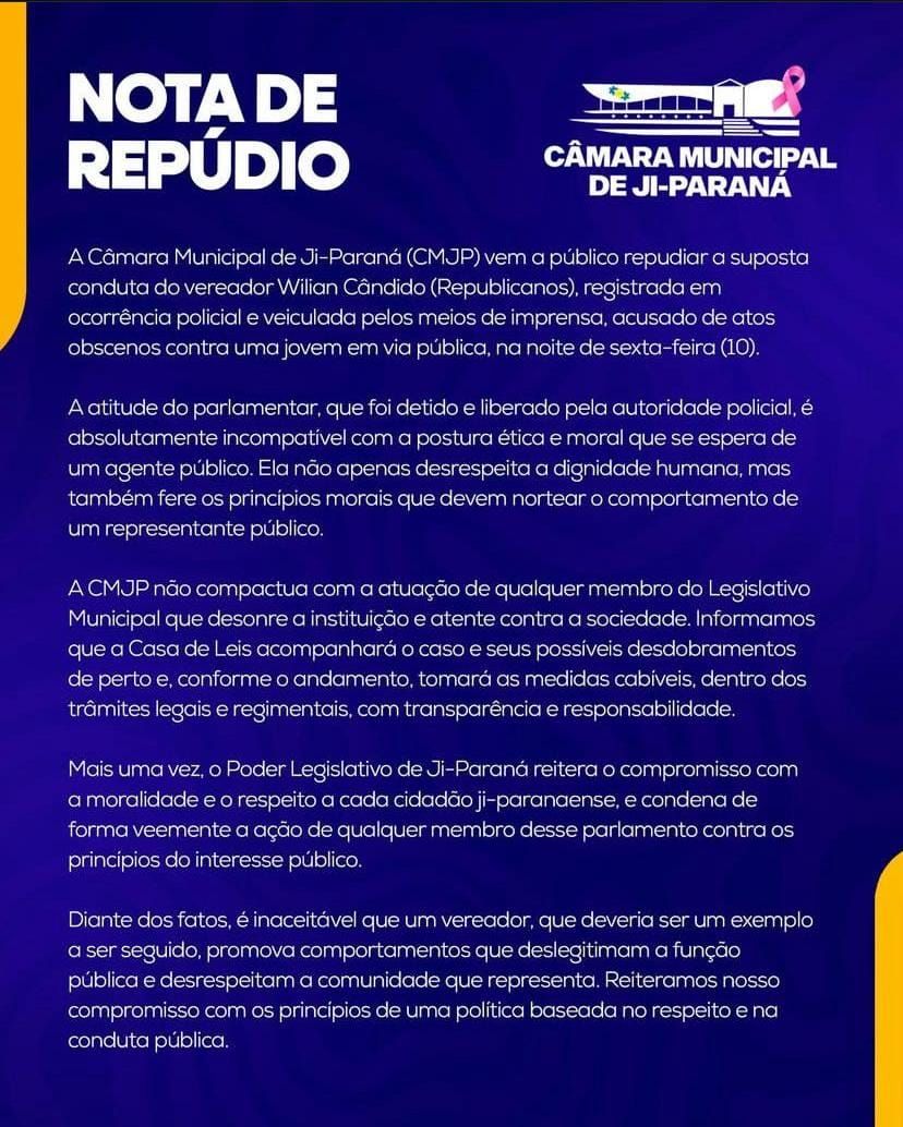 Após forte nota de repúdio emitida pela Câmara Municipal de Ji-Paraná, o vereador Wilian Cândido (Republicanos) pediu afastamento de 90 dias do cargo, alegando motivos particulares. O pedido ocorre um dia após ele ter sido preso por importunação sexual e ato obsceno em via pública.