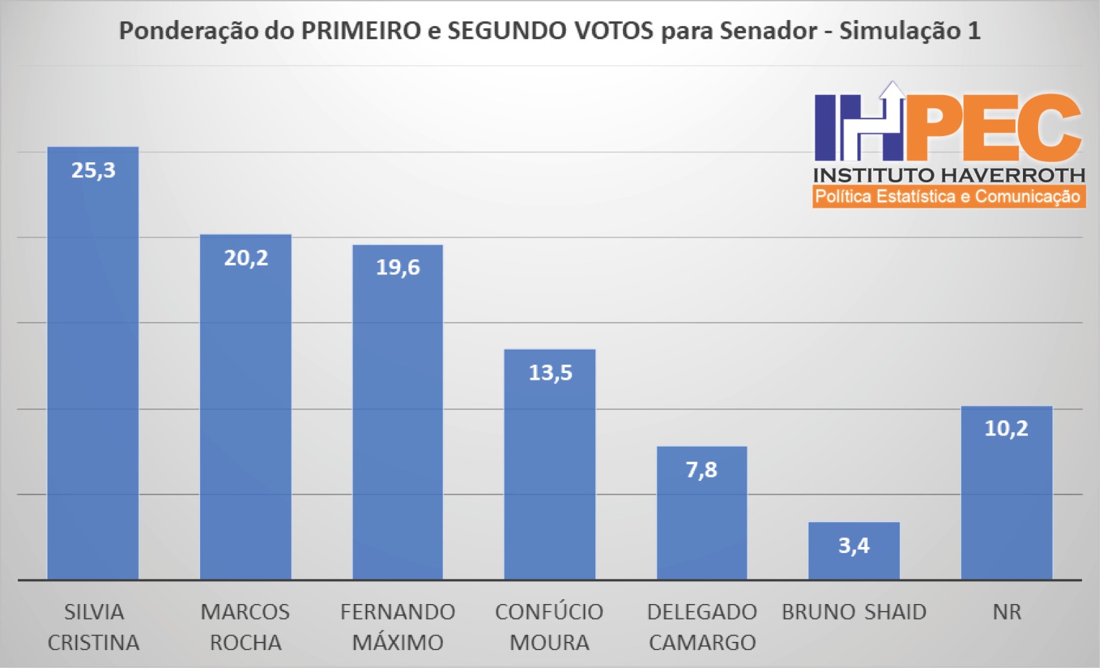 A pesquisa também avaliou a disputa ao Senado Federal, considerando o fato de que o eleitor poderá votar em dois candidatos. Foram feitas duas simulações, ponderando primeiro e segundo votos.
