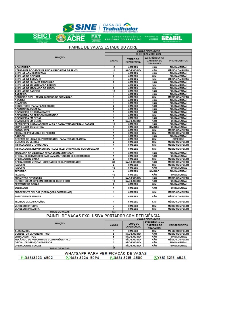 O Sistema Nacional de Emprego do Acre (Sine) está disponibilizando 189 vagas de emprego nesta sexta-feira , 20, para candidatos com nível fundamental e médio. Cerca de 16 dessas oportunidades são destinadas a pessoas com deficiência.