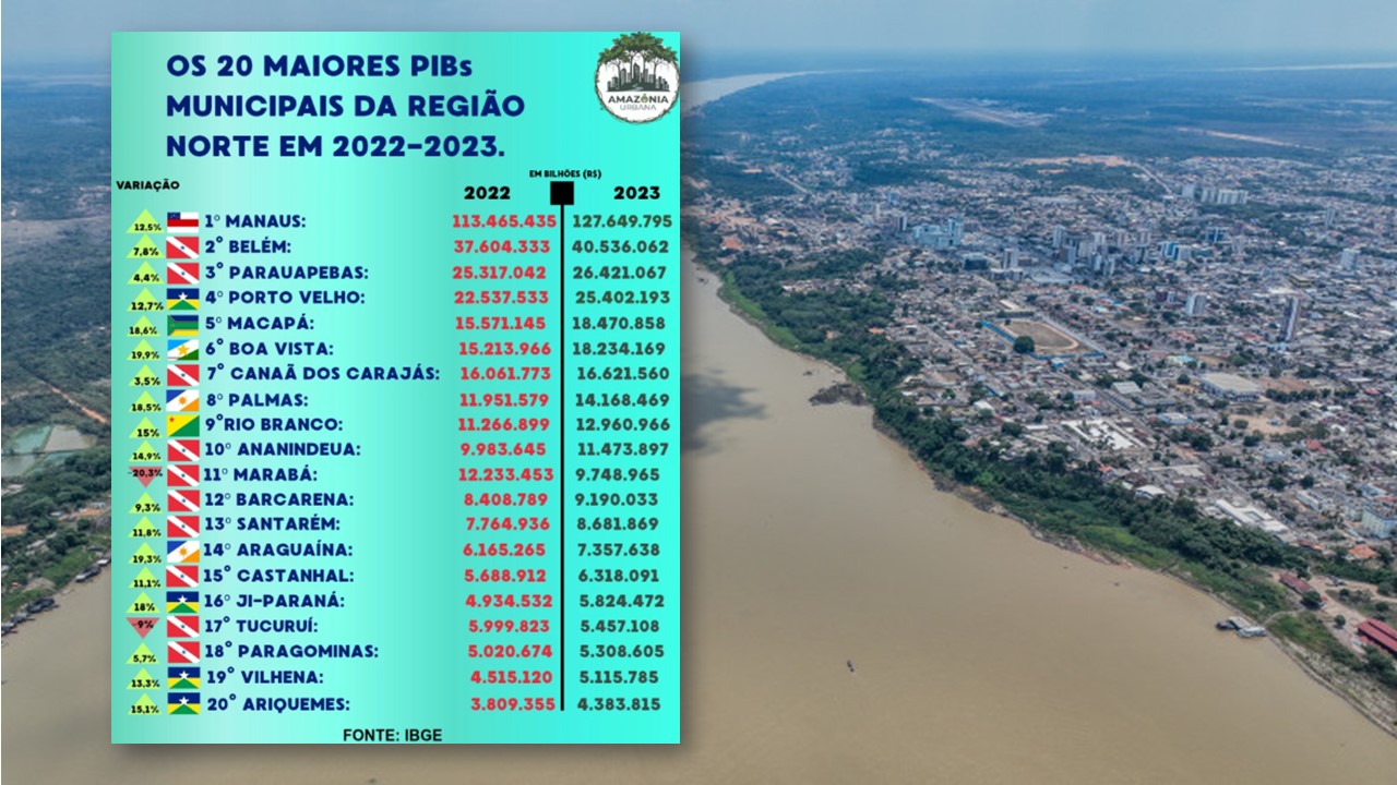 O ranking regional ainda é dominado por municípios do Pará e do Amazonas, com Manaus (AM) mantendo a liderança como maior economia do Norte. Em seguida aparecem Parauapebas (PA), impulsionada pela mineração, Belém (PA), Canaã dos Carajás (PA), outro polo minerador, e Porto Velho (RO), que fecha o top 5 graças ao avanço de atividades ligadas à geração de energia, serviços públicos e logística.