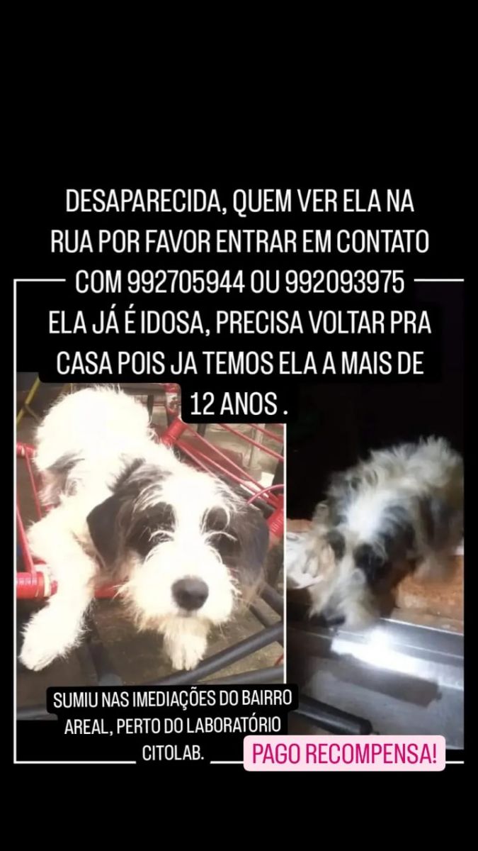 A cachorra Lilica está desaparecida desde a última sexta-feira (16) e seus tutores estão oferecendo uma recompensa para quem encontrá-la. O animal fugiu de casa, no bairro Areal, região Central de Porto Velho (RO).