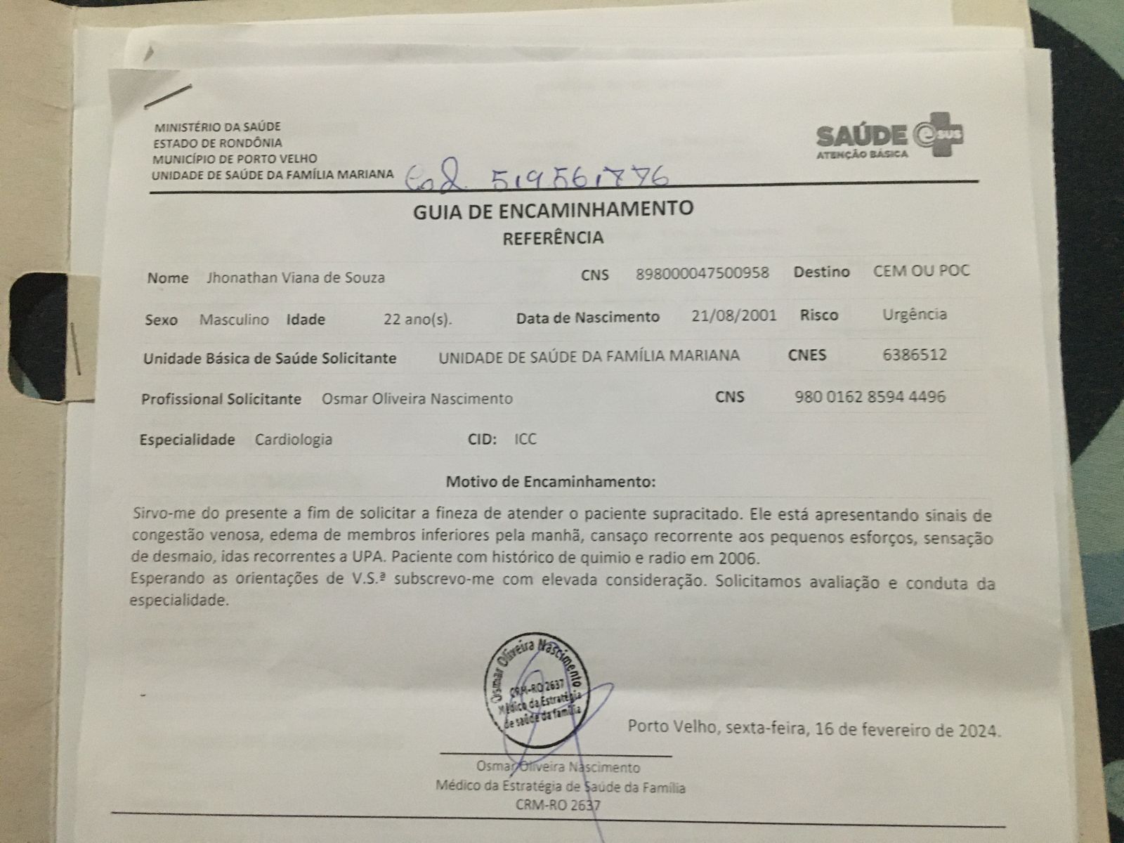 O jovem necessita com urgência de uma consulta com um cardiologista, porém, mesmo após encaminhamento médico feito em fevereiro deste ano, as portas para o atendimento pelo SUS não se abriram. Desde então, tem sido uma batalha incessante para garantir que Jhonathan receba a atenção médica de que tanto necessita.