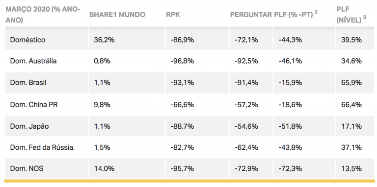 O tráfego doméstico caiu 86,9% em abril, com os maiores declínios registrados na Austrália (-96,8%), Brasil (-93,1%) e EUA (-95,7%). Essa deterioração foi acentuada em comparação com uma queda de 51,0% em março. A capacidade doméstica caiu 72,1% e a taxa de ocupação caiu 44,3 pontos percentuais, para 39,5%.