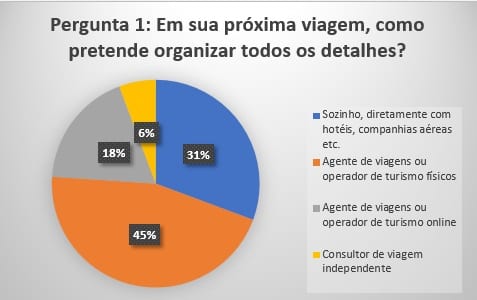 A inspiração para escolher o destino virá de buscas na internet (28%) ou de recomendação de amigos (28%), segundo as respostas. Outras fontes de ajuda incluem dicas dos agentes de viagem (14%), redes sociais (8%), influenciadores e blogueiros de viagem (8%), dicas da imprensa especializada (7%) e publicidade (7%). A forma de compra da viagem será de maneira independente para 50% dos respondentes, entrando em contato diretamente com companhias aéreas e hotéis, entre outras empresas do setor. As agências ou operadoras de viagens físicas e tradicionais mostraram quase o dobro de vantagem na preferência em relação às OTAs (Online Travel Agency, ou agências de viagem online), com 29% das respostas, ante os 15% que optariam pelos serviços de uma empresa virtual. O consultor de viagens independente aparece em 6% das respostas.
