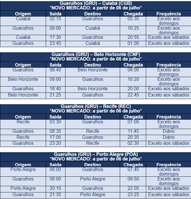 Em julho, a Azul também reabrirá cinco outras bases de operação em todo o país e adicionará novos voos à malha doméstica, como também divulgado pelo M&E no último dia 10. Além de Guarulhos, as bases de Porto Seguro (BA), Marília (SP), João Pessoa (PB), Maceió (AL) e Maringá (PR) voltam a receber voos da companhia, que também reforça operações em Campinas (SP), Belo Horizonte (MG), Recife (PE), Cuiabá (MT) e Rio de Janeiro (RJ). Ao todo, a aérea deve operar 242 voos diários em dia-pico em julho, um acréscimo de 42% frente à malha de junho.