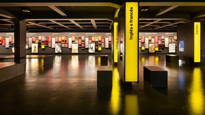 Em uma das novas experiências do museu, 23 mastros se espalham pelo hall do 2º andar, cada um com áudios em um idioma.
