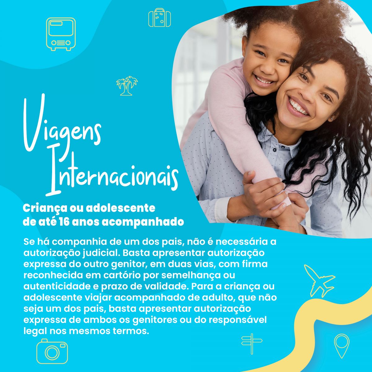 Já para a criança ou adolescente menor de 16 anos acompanhado de parente até o 3º grau (pai, mãe, irmão maior de 18 anos, tios, avós ou bisavós), não é necessária autorização dos pais e nem judicial, basta apresentar o documento da criança ou adolescente, com foto, e do acompanhante para comprovação do parentesco.