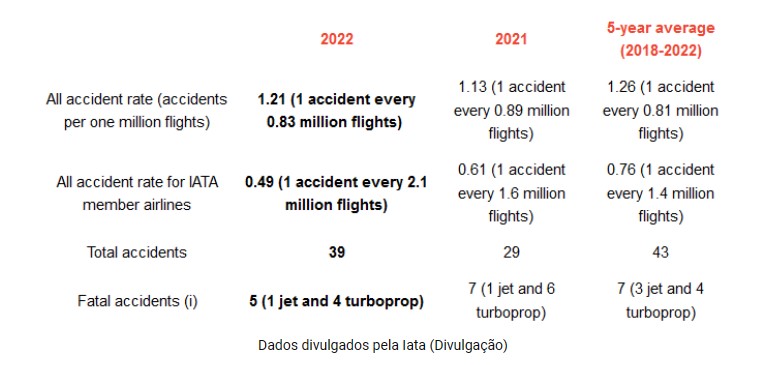 A Associação Internacional de Transporte Aéreo (Iata) divulgou seu Relatório de Segurança de 2022 para a aviação global, que mostrou uma redução no número de acidentes fatais e no risco de fatalidade, em relação a 2021 e à média de cinco anos (2018- 2022). Em 2022, portanto, ocorreram cinco acidentes fatais envolvendo a perda de vidas de passageiros e tripulantes, número menor que os sete acidentes de 2021 e uma melhoria na média de cinco anos (2018-2022), que também foi de sete.