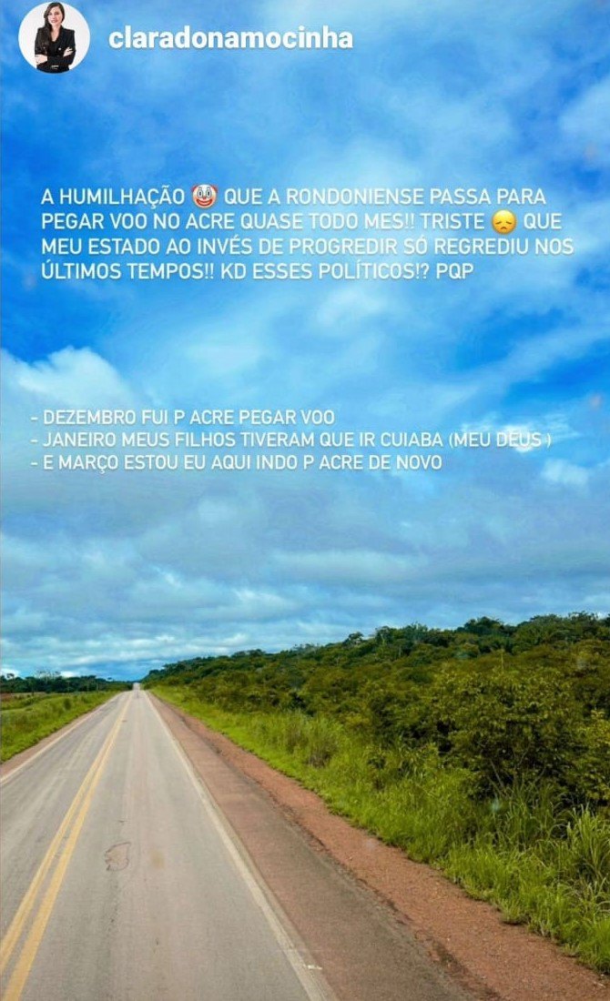 “Meu pai: 70 anos, desbravou RO. Trabalhou sem parar por 40 anos nesse estado. Agora tem que pegar ônibus para ir até o Acre para pagar ainda um absurdo, porém metade do valor que seria saindo de RO! Pensem nos idosos, nos cadeirantes, nas pessoas com problemas reais! Precisamos fazer algo! Regredimos 20 anos! Estamos acabando Rondônia!!!”.