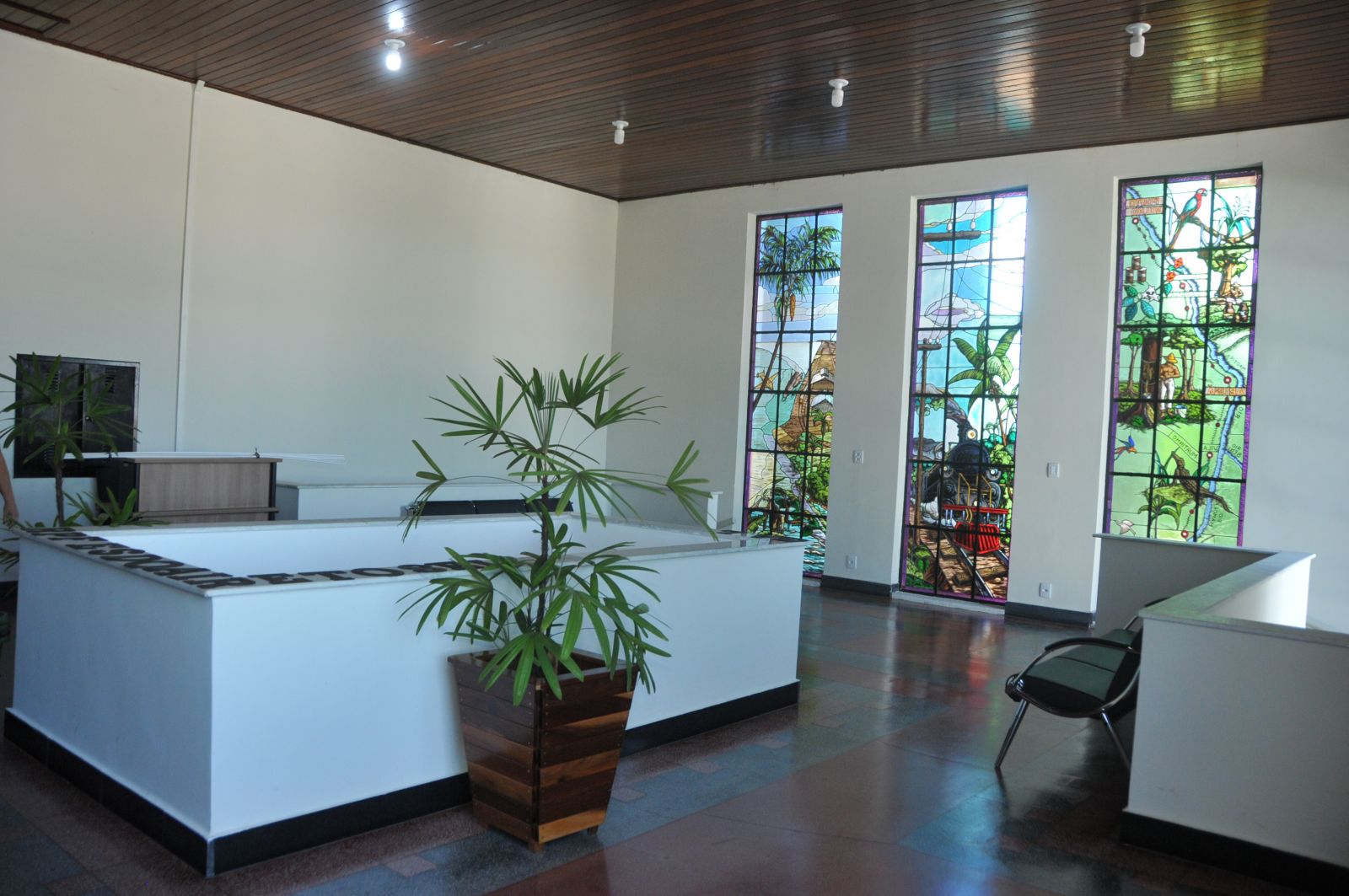 Na entrada principal estão à mostra vitrôs, que representam os ciclos econômicos da região. A linha férrea, o Rio Madeira e a flora da Amazônia são alguns dos assuntos apresentados nos vidros coloridos do prédio.