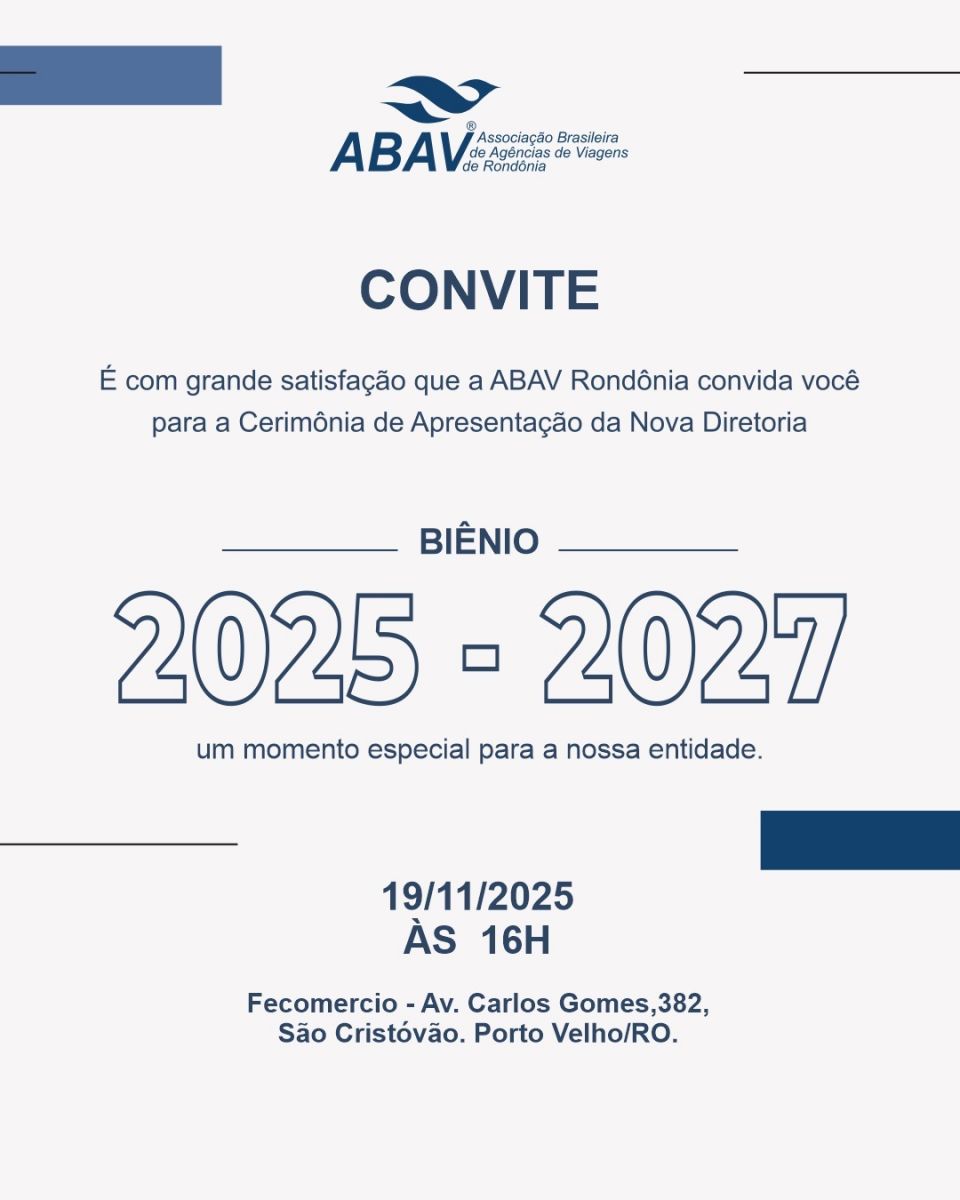 A Associação Brasileira de Agências de Viagens – Seccional Rondônia (ABAV-RO) realiza nesta quarta-feira, 19 de novembro, a cerimônia de posse da sua nova diretoria.